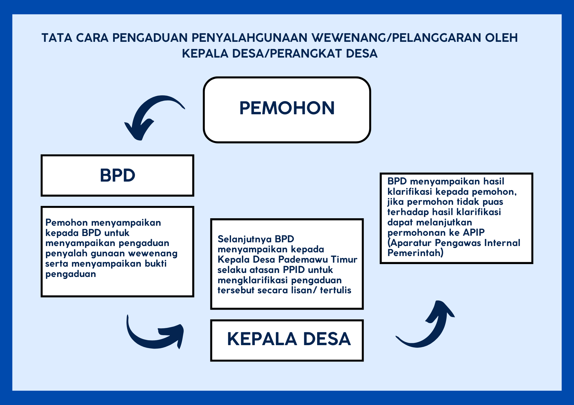 Untuk mewujudkan pemerintahan yang baik dan untuk membangun kepercayaan masyarakat terhadap pelayanan publik. Pemerintah Desa Pademawu Timur Kecamatan Pademawu Kabupaten Pamekasan menyediakan fasilitas kepada masyarakat untuk dapat melaporkan/mengadukan tindakan pejabat publik Desa Pademawu Timur yang tidak sesuai atau menyalahgunakan kewenanganya dalam menjalankan tugas. Hal ini sebagai tolok ukur meningkatkan pengelolaan dan pelayanan di lingkungan Badan Publik Untuk menghasilkan layanan informasi yang berkualitas.